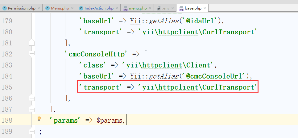 2、通过应用组建配置客户端,删除 ‘transport’ => ‘yii\httpclient\CurlTransport’ 此项配置,如图2