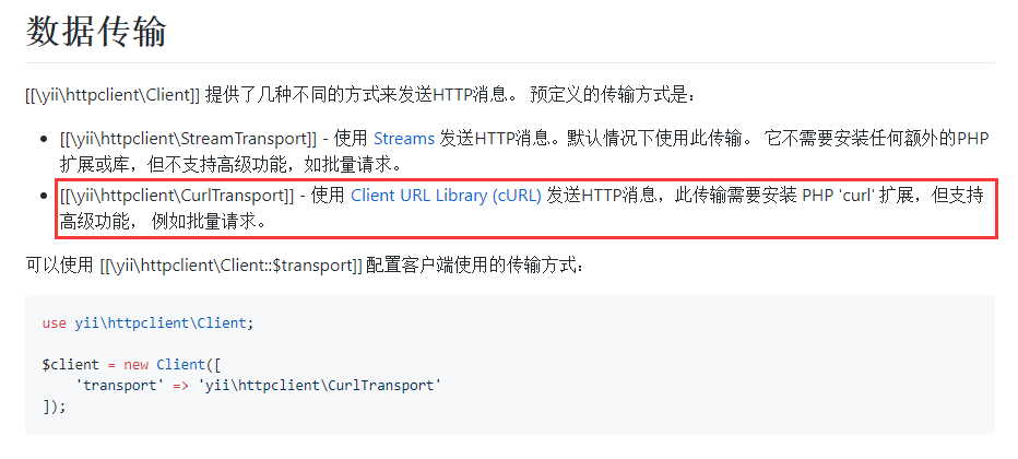 4、查看文档:https://github.com/yiisoft/yii2-httpclient/blob/master/docs/guide-zh-CN/usage-transports.md ,CurlTransport可支持高级功能,例如批量请求(因此,由于有批量请求的需要,必须配置客户端使用的传输方式为CurlTransport),如图4