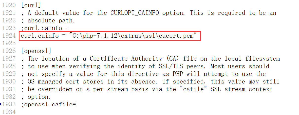 6、编辑 php.ini,修改 ;curl.cainfo = 为 curl.cainfo = “C:\php-7.1.12\extras\ssl\cacert.pem”,重启PHP,如图6