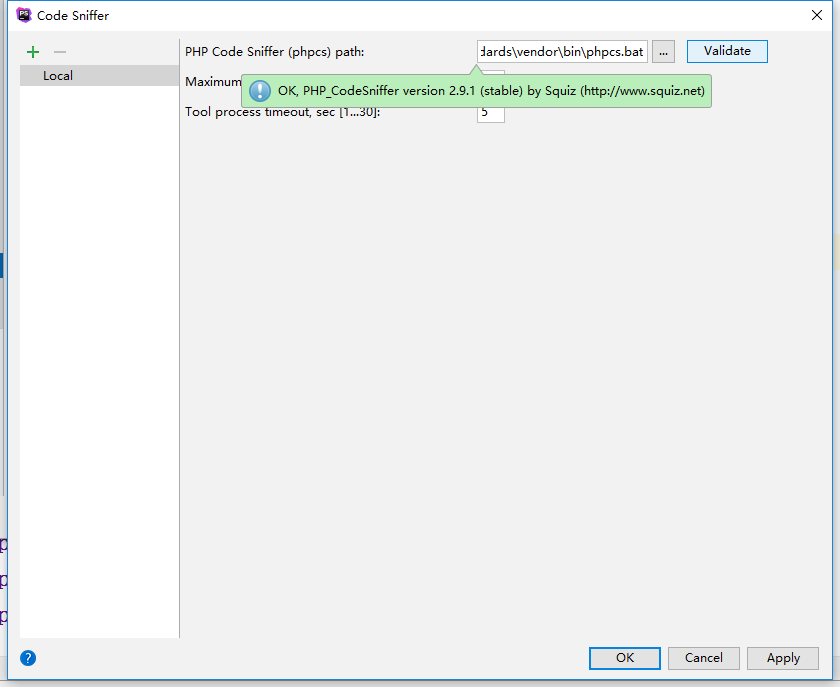 10、单击 Validate 按钮,如果验证通过成功,PhpStorm 将显示检测到的代码嗅探器版本信息,如图10