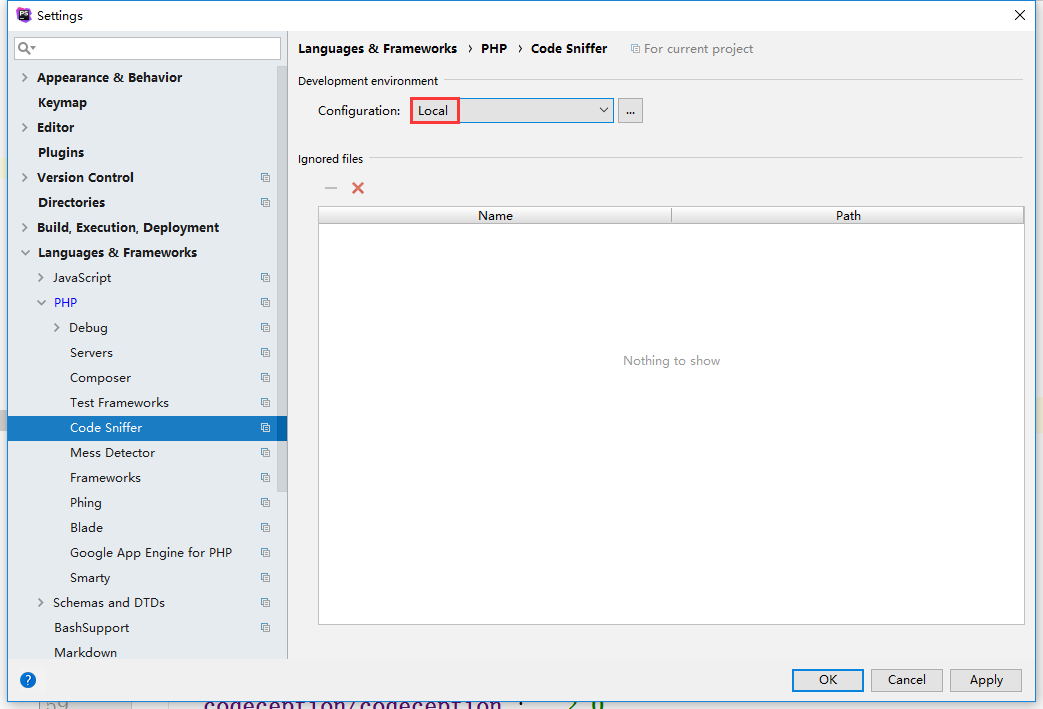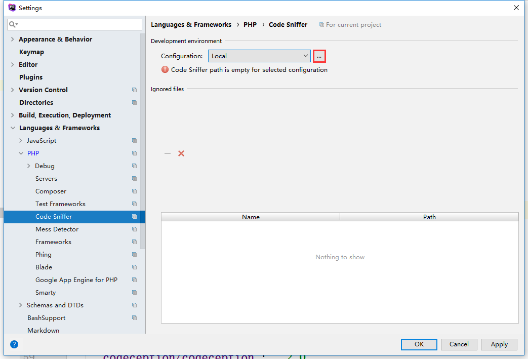 8、选择使用的代码嗅探器脚本,File | Settings → Languages & Frameworks → PHP → Code Sniffer → Configuration: Local下拉列表旁边的按钮,如图8