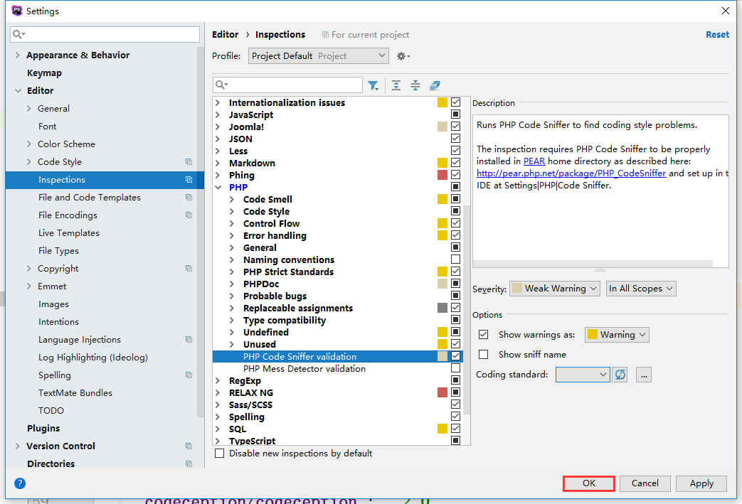 12、将PHP代码嗅探器配置为PhpStorm检查,File | Settings → Editor → Inspections → PHP → PHP Code Sniffer validation,如图12