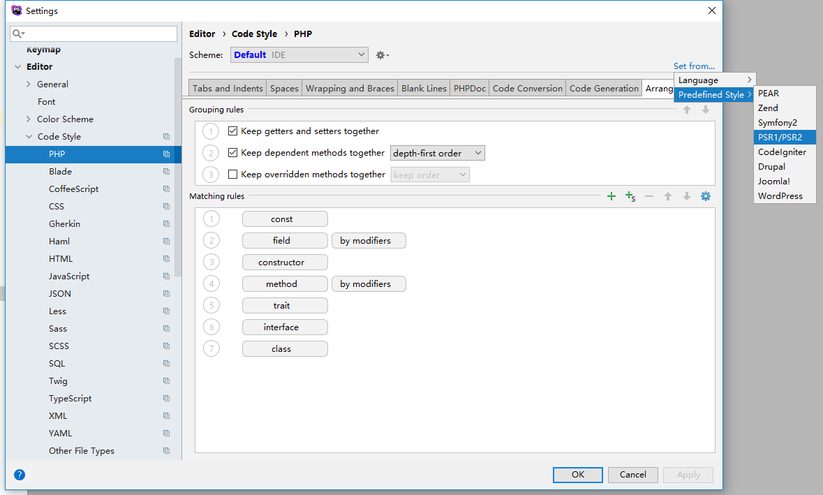 13、Yii使用PSR-1和PSR-2作为代码风格标准,File | Settings → Editor → Code Style → PHP → Set from… → Predefined Style → PSR1/PSR2,如图13