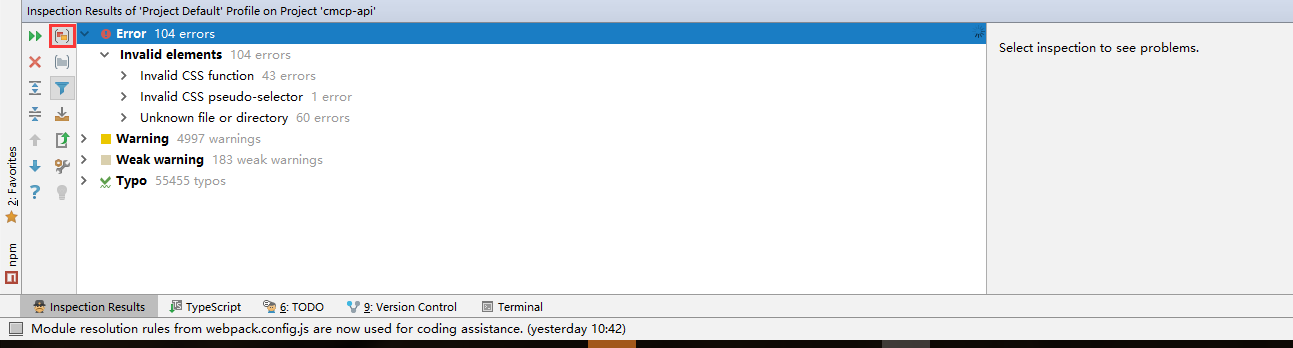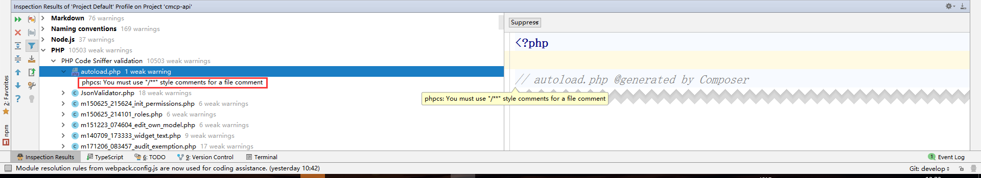 15、在 Inspection Results Tool Window 中查看检查结果,PHP代码嗅探器报告的错误和警告具有phpcs前缀以区别于PhpStorm内部检查,如图15
