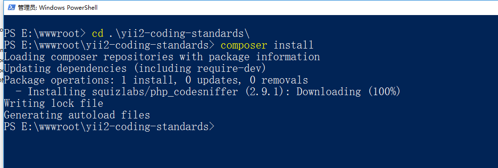 3、进入 E:\wwwroot\yii2-coding-standards 目录,执行安装,如图3