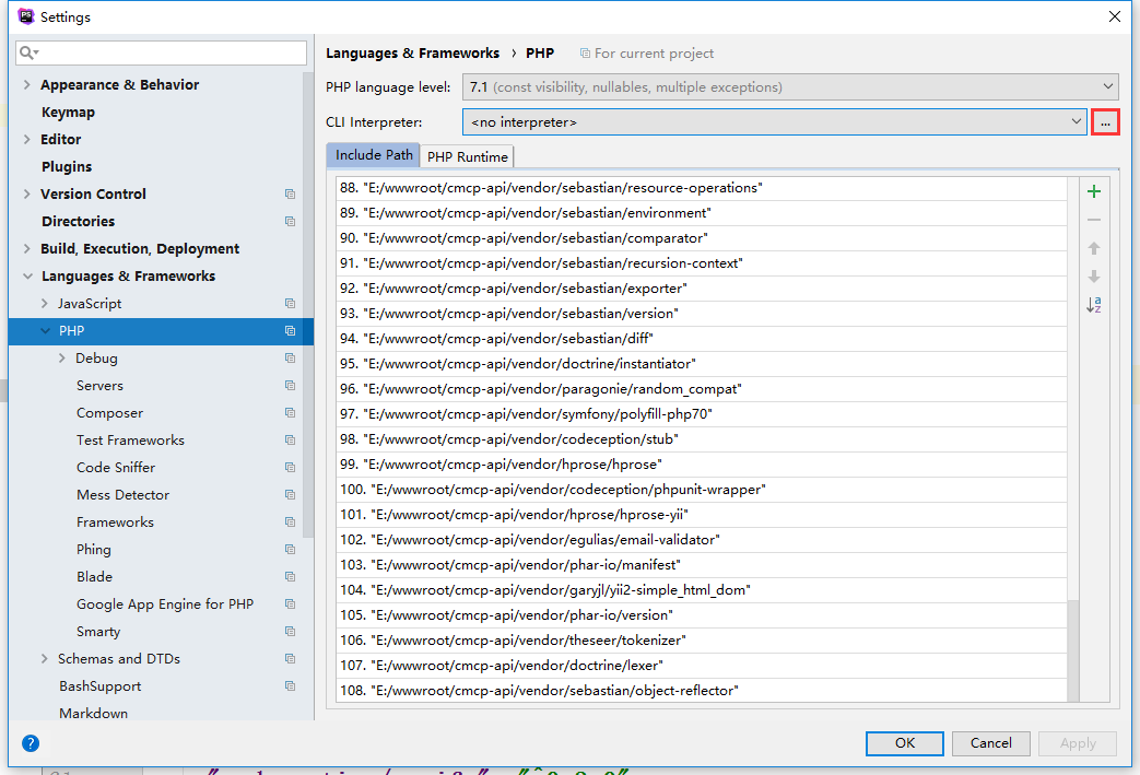 4、配置本地PHP解释器,File | Settings → Languages & Frameworks → PHP → CLI Interpreter 下拉列表旁边的按钮,如图4