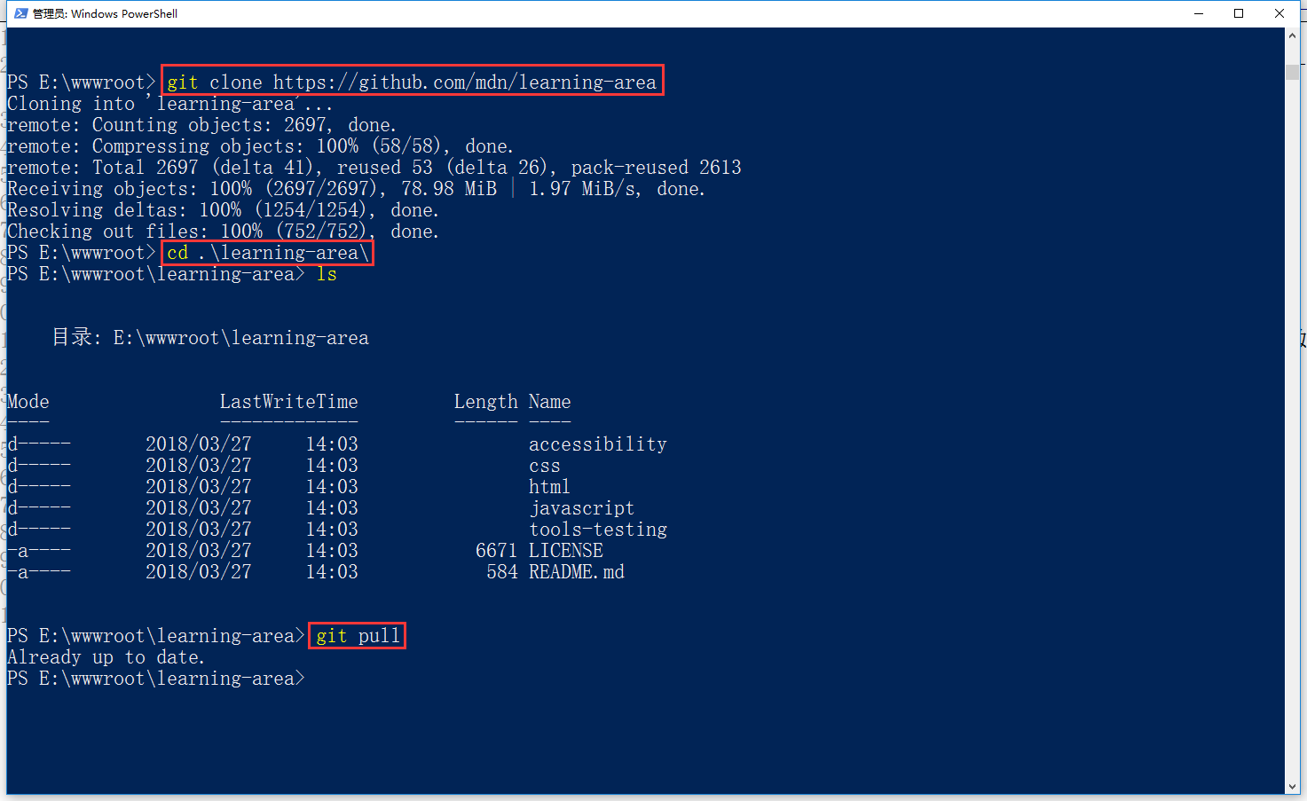 git clone https://github.com/mdn/learning-area cd .\learning-area\ git pull