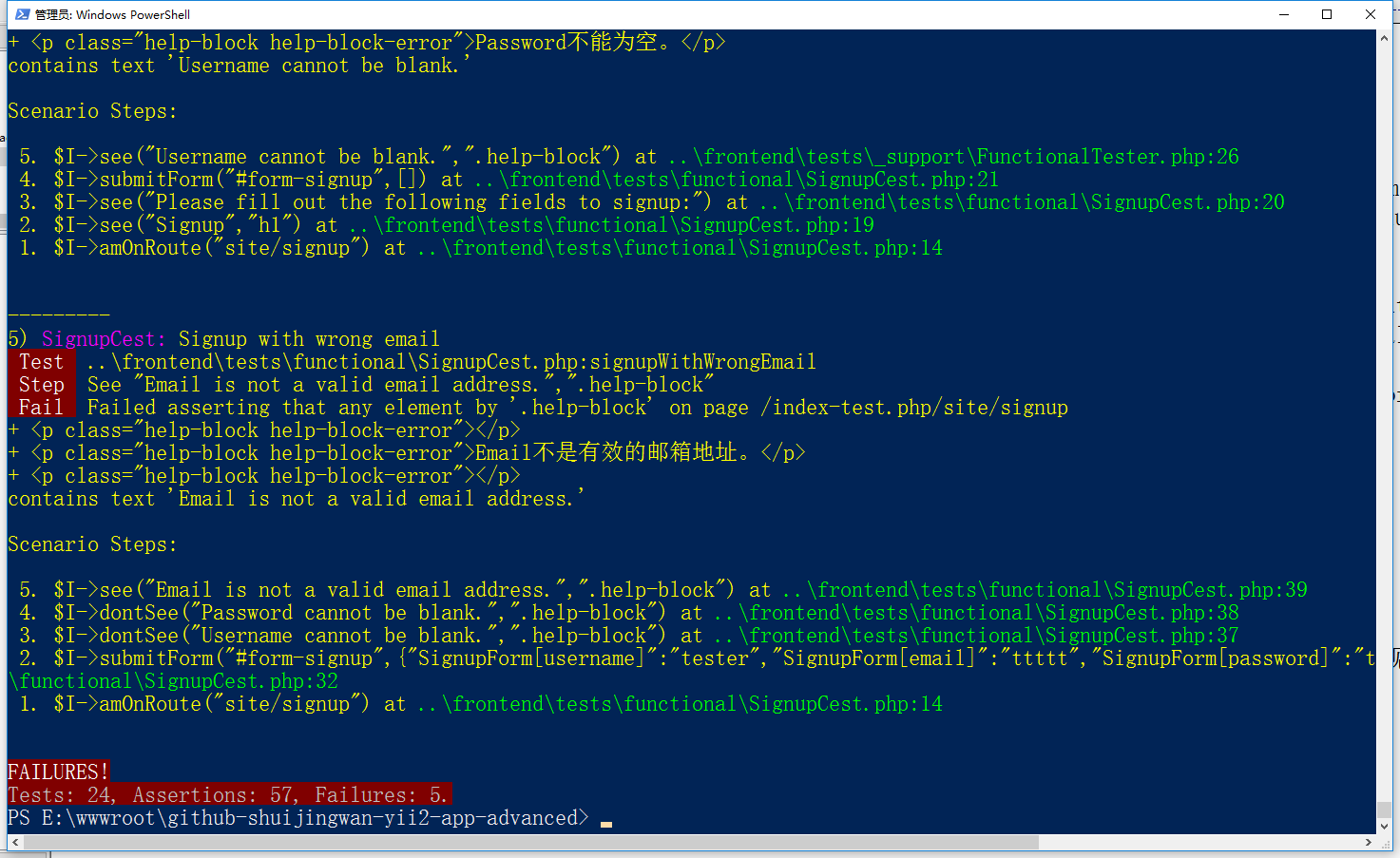 3、运行所有的样例测试,报错:FAILURES! Tests: 24, Assertions: 57, Failures: 5,如图1
