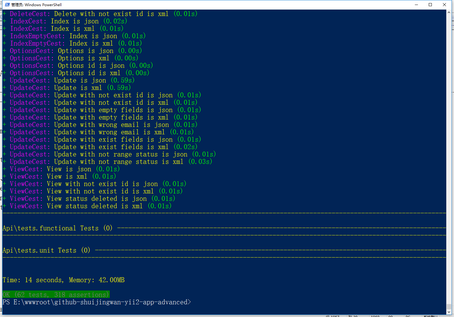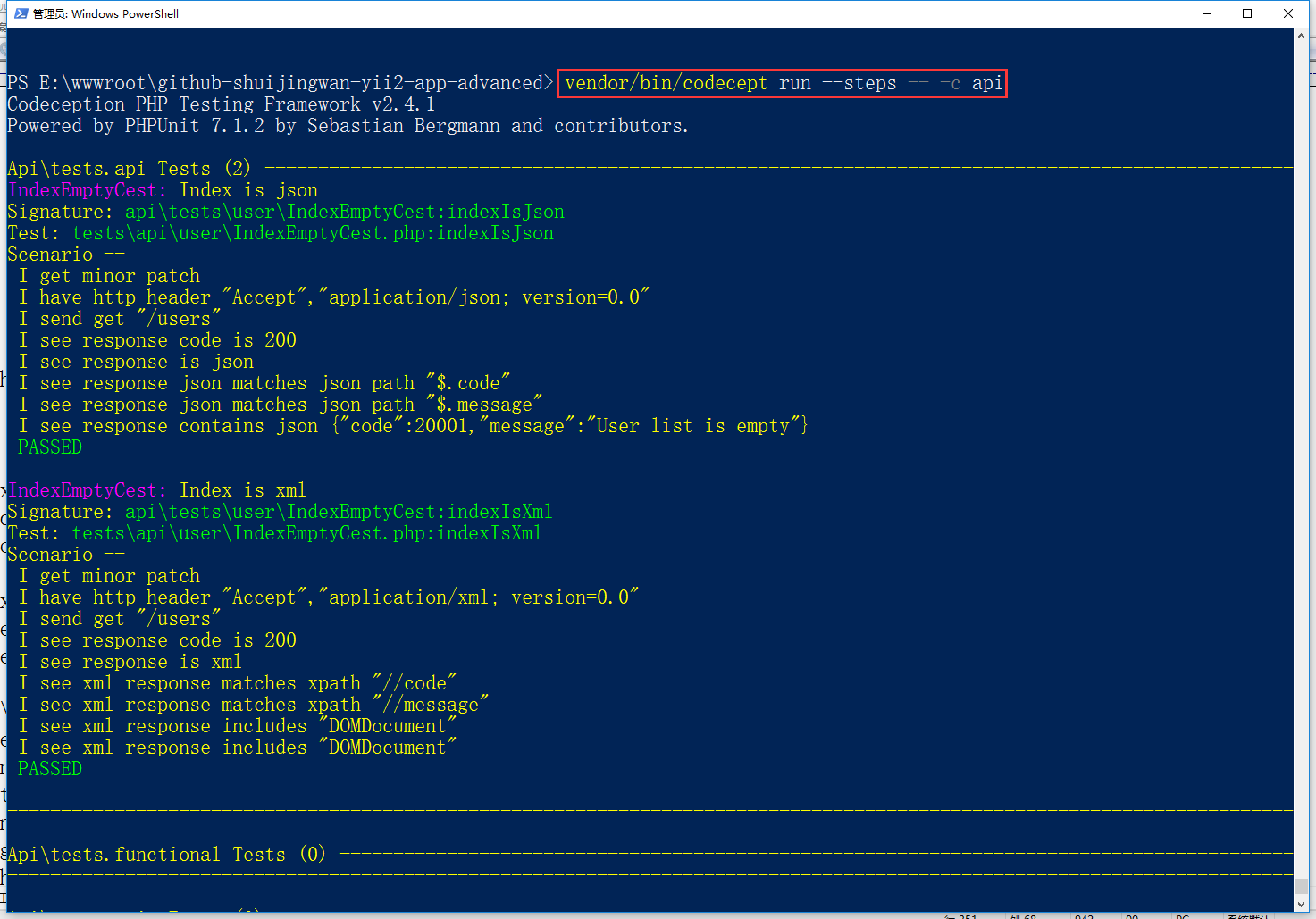 31、运行测试,仅测试 api user/OptionsCest.php,获取详细的输出,可看到一步一步的行为报告,符合预期
