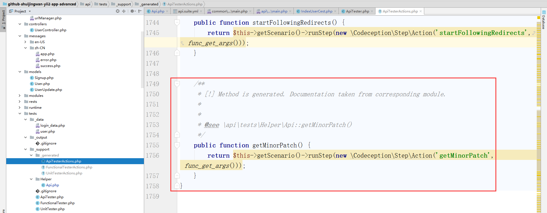 2、删除测试(单元测试、功能测试、验收测试)的相关文件,删除 \api\tests\acceptance\HomeCest.php,删除 \api\tests\functional\AboutCest.php、\api\tests\functional\ContactCest.php、\api\tests\functional\HomeCest.php、\api\tests\functional\LoginCest.php、\api\tests\functional\SignupCest.php,删除 \api\tests\unit\models\ContactFormTest.php、\api\tests\unit\models\PasswordResetRequestFormTest.php、\api\tests\unit\models\ResetPasswordFormTest.php、\api\tests\unit\models\SignupFormTest.php