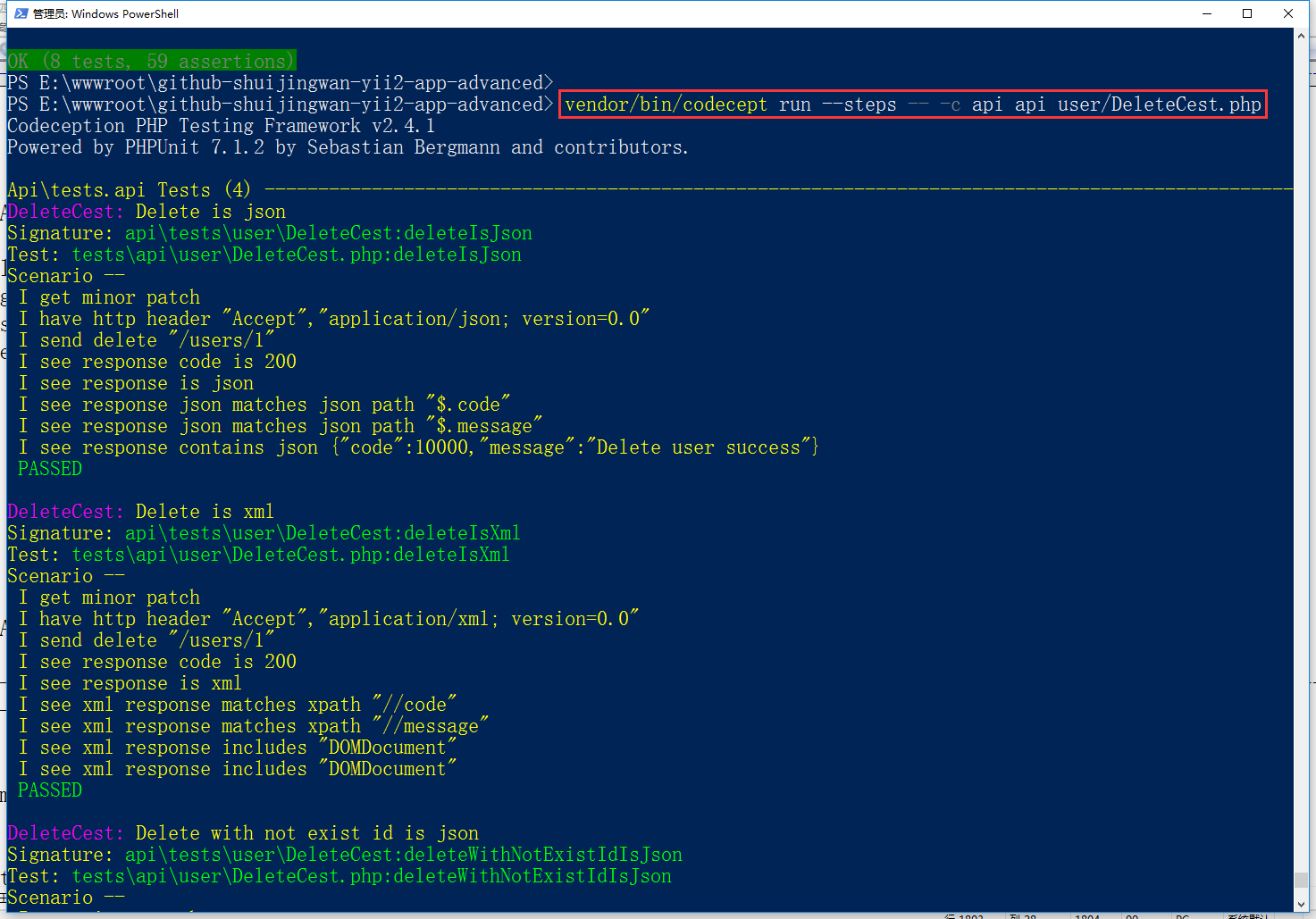 vendor/bin/codecept run --steps -- -c api api user/DeleteCest.php