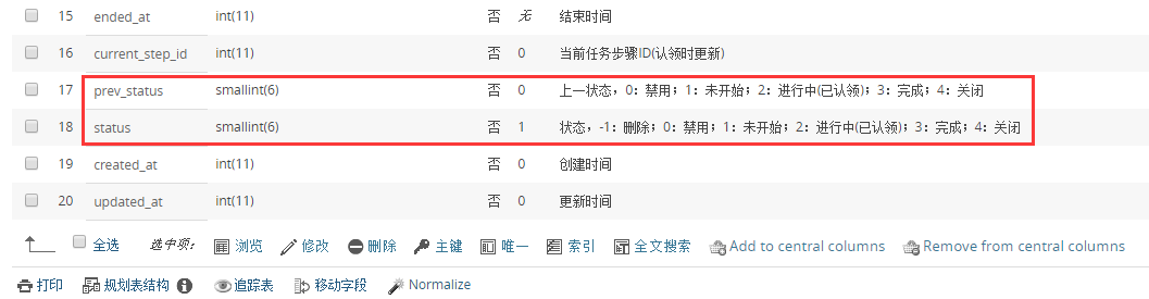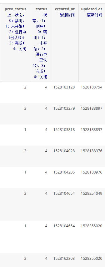 1、使用 updateAll() 更新 prev_status 的值为 status 的值,更新 status 的值为 4,表结构如图1