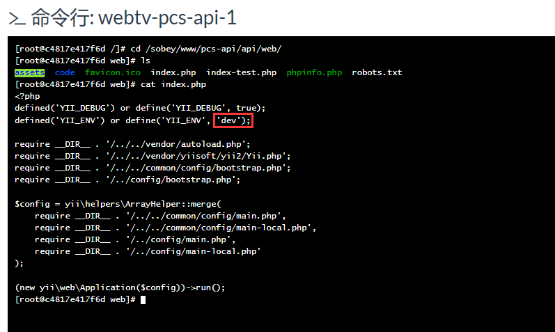 如果已设置环境变量:PCS_API_CFG_ENV,其值为:dev,则执行命令:php /sobey/www/pcs-api/init –env=Development –overwrite=All;其值为:prod,则执行命令:php /sobey/www/pcs-api/init –env=Production –overwrite=All;否则输出:please set environment variable PCS_API_CFG_ENV dev or prod