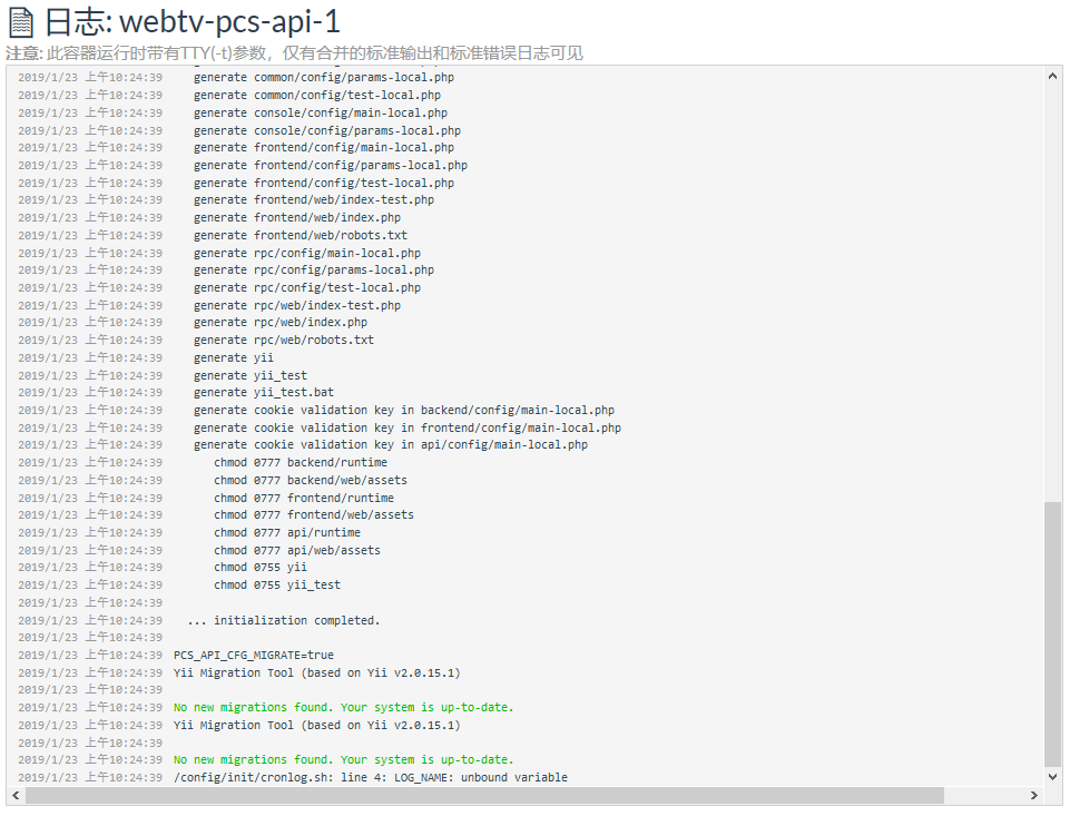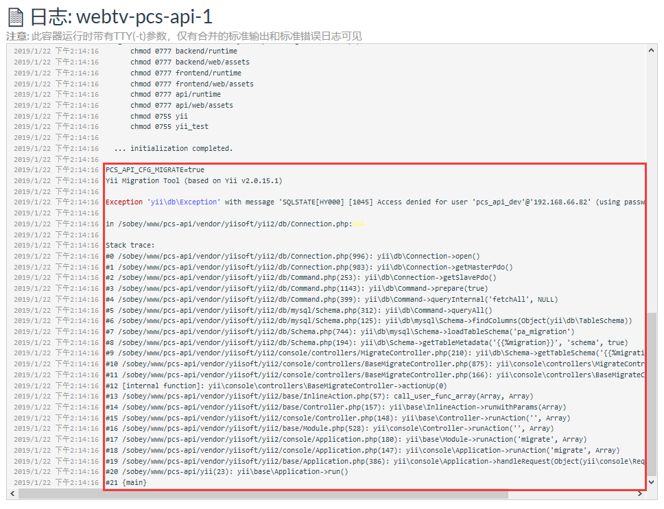 如果已设置环境变量:PCS_API_CFG_MIGRATE,其值为:true,则依次执行命令:php /sobey/www/pcs-api/yii migrate –migrationPath=@yii/log/migrations/ –interactive=0、php /sobey/www/pcs-api/yii migrate –interactive=0,查看容器日志,数据库密码错误,如图11