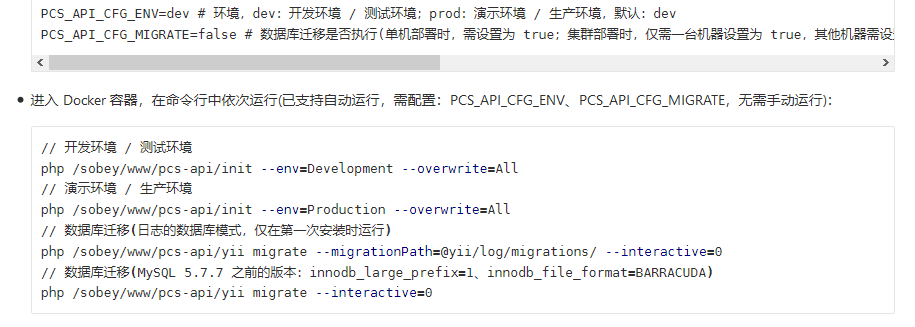 // 开发环境 / 测试环境 php /sobey/www/pcs-api/init --env=Development --overwrite=All // 演示环境 / 生产环境 php /sobey/www/pcs-api/init --env=Production --overwrite=All // 数据库迁移(日志的数据库模式,仅在第一次安装时运行) php /sobey/www/pcs-api/yii migrate --migrationPath=@yii/log/migrations/ --interactive=0 // 数据库迁移(MySQL 5.7.7 之前的版本:innodb_large_prefix=1、innodb_file_format=BARRACUDA) php /sobey/www/pcs-api/yii migrate --interactive=0