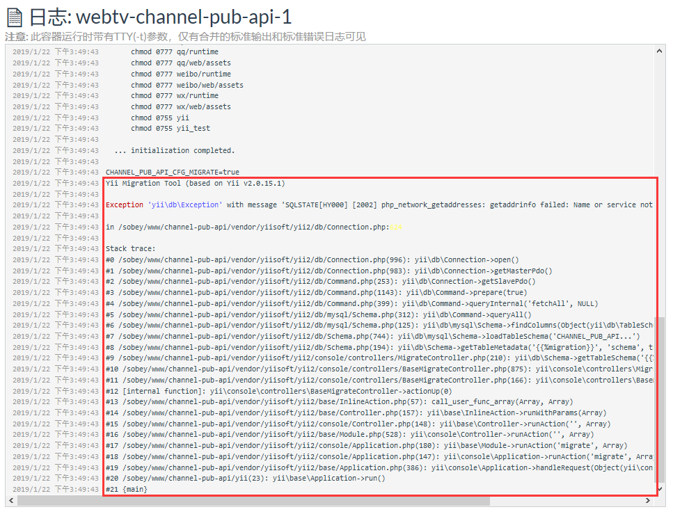 10、在另一个项目中,在 Rancher 中升级容器时,自动执行数据库迁移命令报错:Exception ‘yii\db\Exception’ with message ‘SQLSTATE[HY000] [2002] php_network_getaddresses: getaddrinfo failed: Name or service not known’,如图13