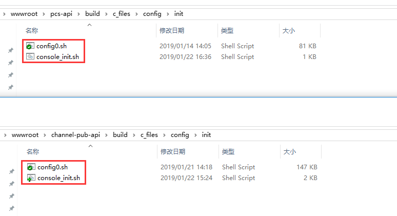 13、对比两个项目的差异,原因在于:\build\c_files\config\init 目录中的文件执行顺序的差异导致的,要想确保命令行成功执行,需要确保 config0.sh 文件执行后,pcs-api_init.sh/channel-pub-api_init.sh 文件再执行,但是在 channel-pub-api 中,却是 channel-pub-api_init.sh 先于 config0.sh 之前执行,如图14