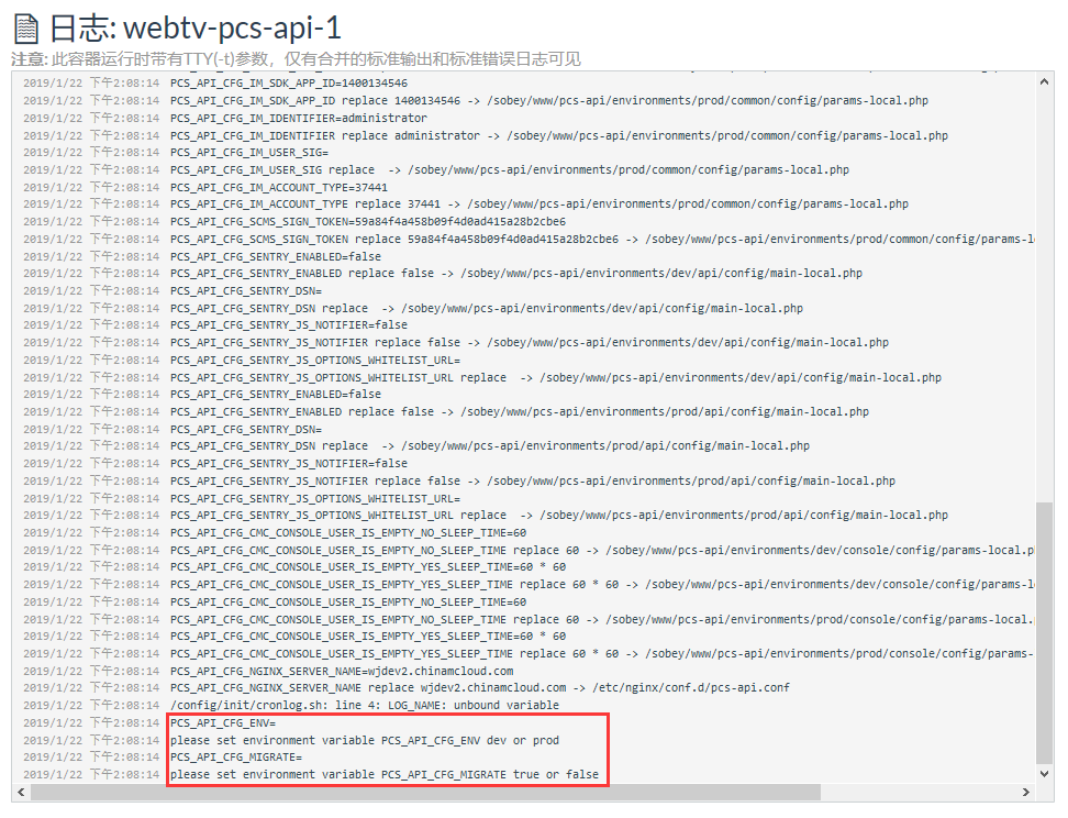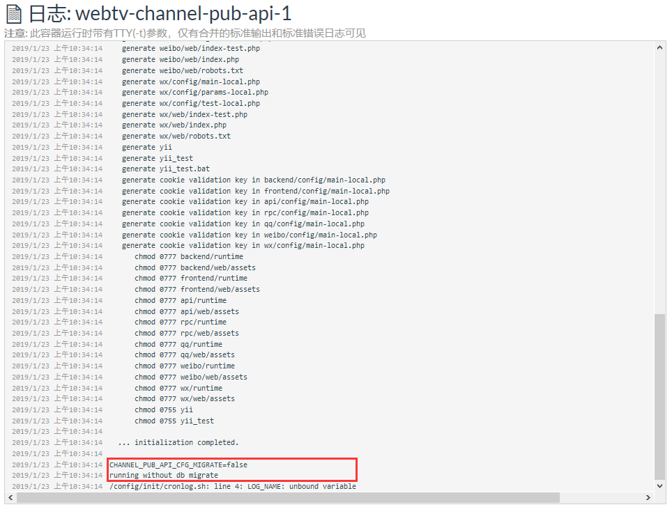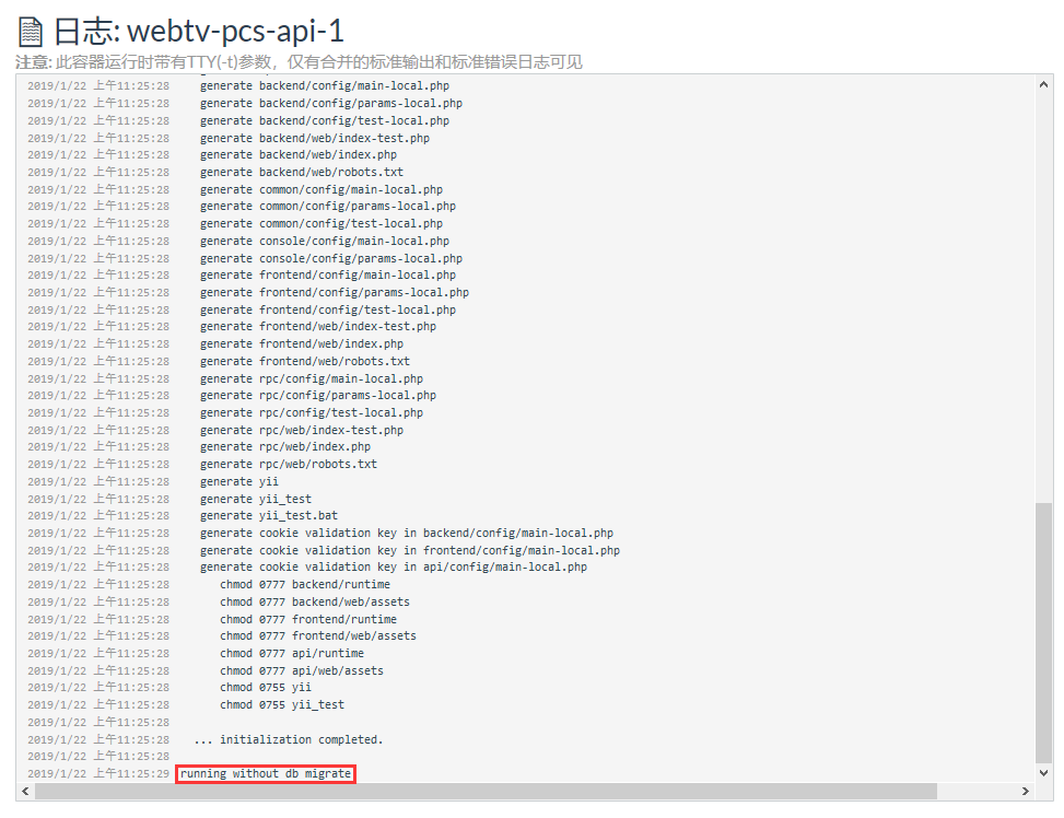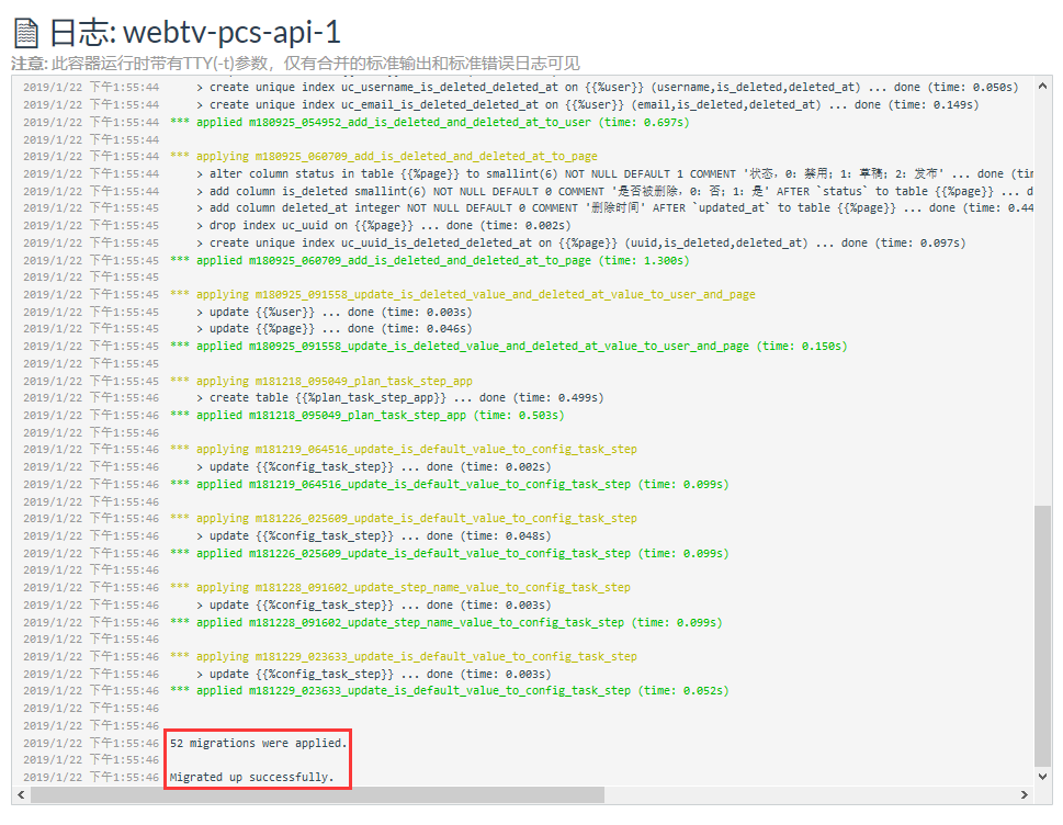 如果已设置环境变量:PCS_API_CFG_MIGRATE,其值为:false,则输出:running without db migrate