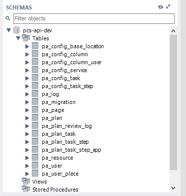 4、删除开发环境中的数据库中的所有表,未设置环境变量:PCS_API_CFG_ENV、PCS_API_CFG_MIGRATE,以测试未设置环境变量时,默认值的设置是否生效,符合预期