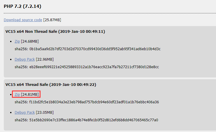 1、网址:https://windows.php.net/download#php-7.2 ,下载 VC15 x64 Thread Safe,如图1