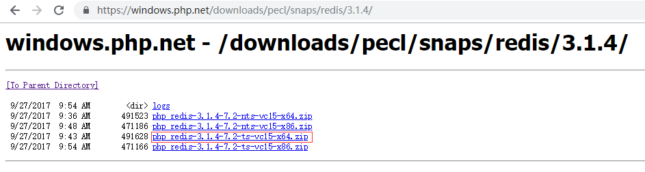 6、网址:https://windows.php.net/downloads/pecl/snaps/redis/ ,下载 php_redis-3.1.4-7.2-ts-vc15-x64.zip,复制至 C:\php-7.2.14\ext\php_redis.dll,以在 PHP 中支持 Redis,如图3