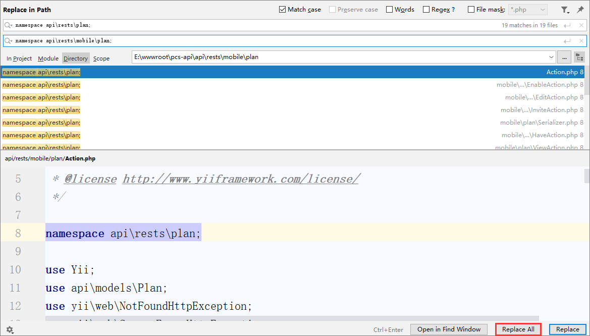13、复制 \api\rests\plan 至 \api\rests\mobile\plan,批量替换命名空间,如图6