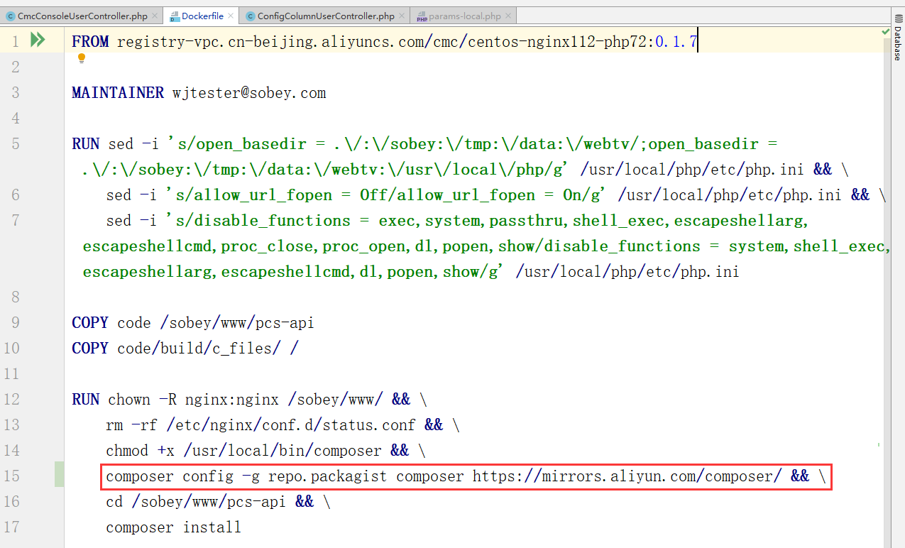 4、在 Docker 部署 中,在全局配置中启用 阿里云 Composer 全量镜像,编辑文件 Dockerfile,如图3