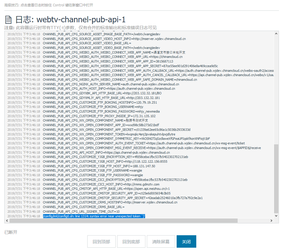 2019/7/31 下午3:46:16CHANNEL_PUB_API_CFG_URL_SIGNER_TIME_OUT=10 2019/7/31 下午3:46:16/config/init/config0.sh: line 1314: syntax error near unexpected token `}'