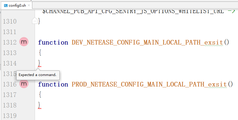 2、在 PhpStorm 中,编辑 /config/init/config0.sh,提示:Expected a command. ,注释掉相应代码,如图2