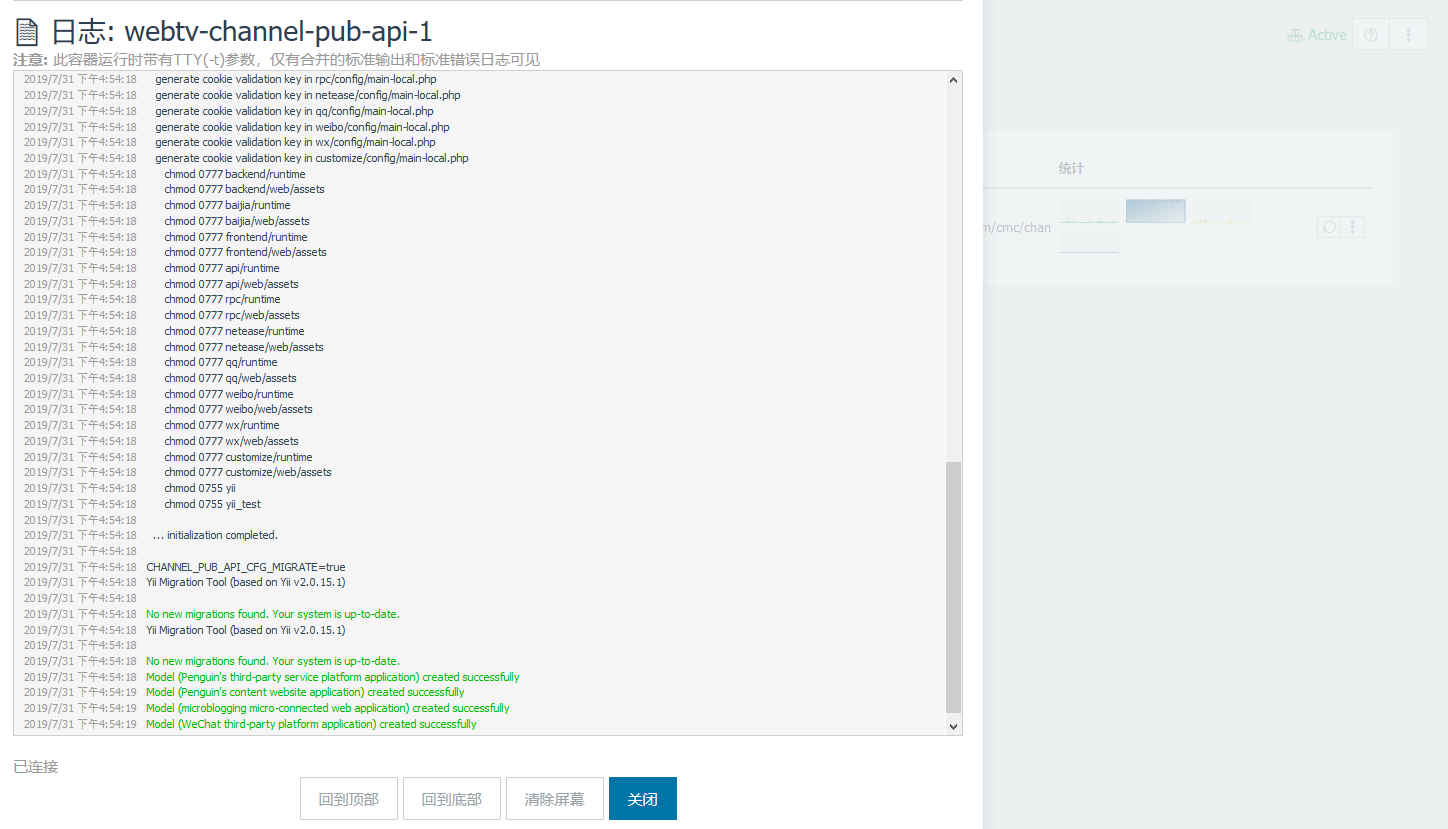 2019/7/31 下午4:54:18No new migrations found. Your system is up-to-date. 2019/7/31 下午4:54:18Model (Penguin's third-party service platform application) created successfully 2019/7/31 下午4:54:19Model (Penguin's content website application) created successfully 2019/7/31 下午4:54:19Model (microblogging micro-connected web application) created successfully 2019/7/31 下午4:54:19Model (WeChat third-party platform application) created successfully