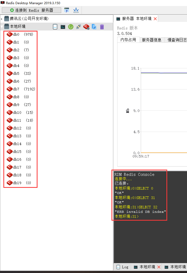 5、打开 RedisDesktopManager,数量变化为 20,但是已经可以执行 SELECT 0 – 31 的命令,如图2