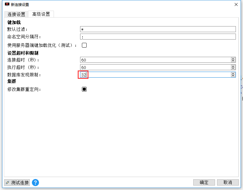 6、删除连接,新连接设置 – 高级设置 – 数据库发现限制,其值默认为 20 ,编辑为 32,如图3