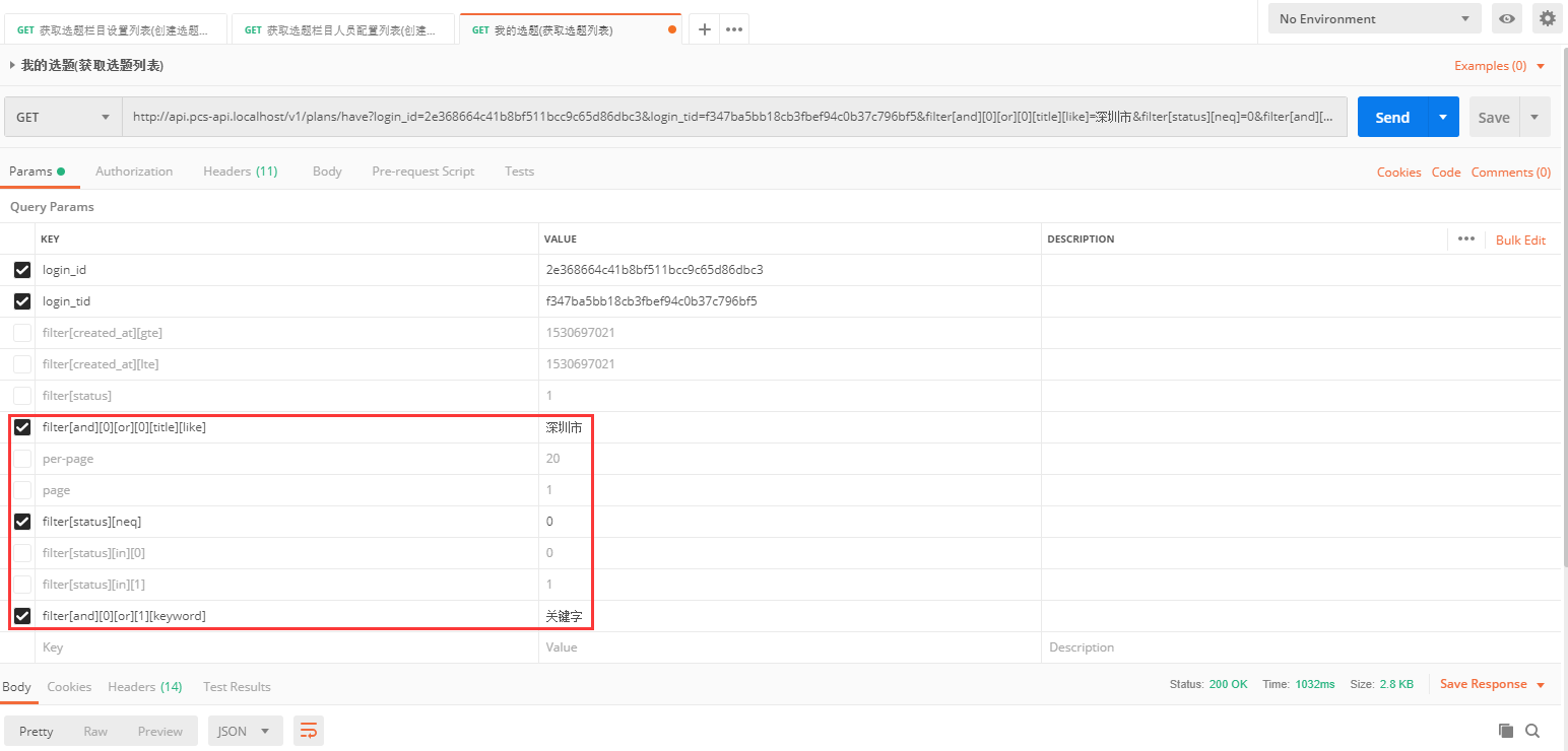 9、在 Postman 中打开网址:http://api.pcs-api.localhost/v1/plans/have?login_id=2e368664c41b8bf511bcc9c65d86dbc3&login_tid=f347ba5bb18cb3fbef94c0b37c796bf5&filter[and][0][or][0][title][like]=深圳市2&filter[status][neq]=0&filter[and][0][or][1][keyword][fis]=关键字3 ,如图5