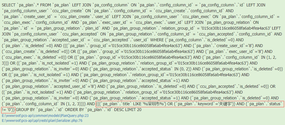 SELECT `pa_plan`.* FROM `pa_plan` WHERE (((`pa_plan`.`title` LIKE '%深圳市%') OR (`pa_plan`.`keyword`='关键字')) AND (`pa_plan`.`status` != '0')) GROUP BY `pa_plan`.`id` ORDER BY `pa_plan`.`id` DESC LIMIT 20