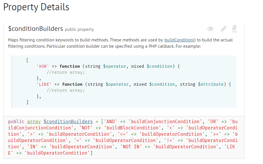 6、打开网址:https://www.yiiframework.com/doc/api/2.0/yii-data-activedatafilter#$conditionBuilders-detail ,基于映射过滤条件关键字以构建方法。 buildCondition() 使用这些方法来构建实际的过滤条件。可以使用 PHP 回调指定特定条件构建器的实现,如图4