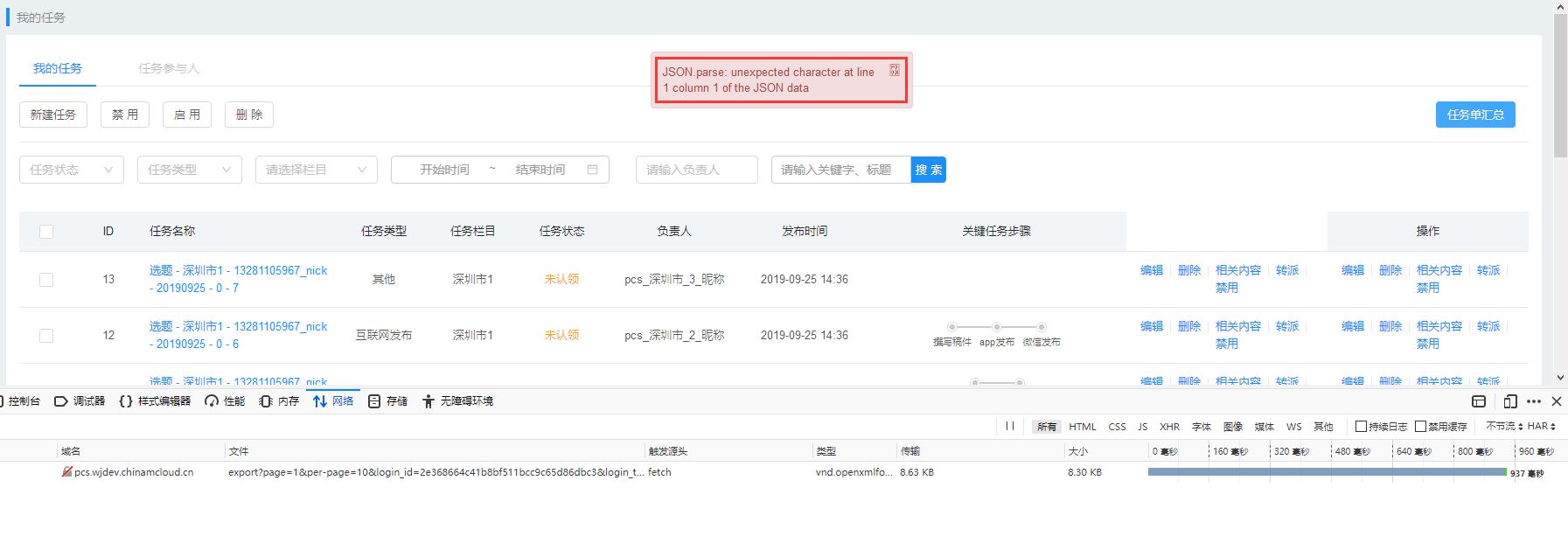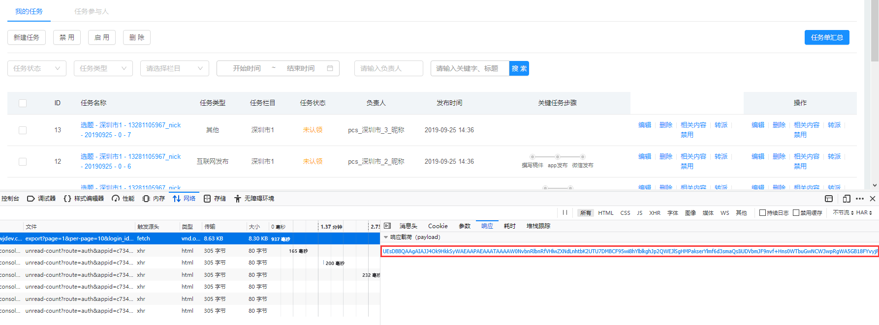 14、在前端(基于 Ant Design)页面中,请求网址:http://api.pcs-api.localhost/v1/plan-tasks/export ,响应乱码,并未下载文件,如图10