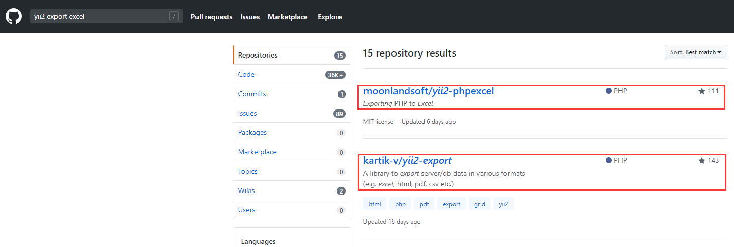 2、在 GitHub 中搜索:yii2 export excel,其结果:moonlandsoft/yii2-phpexcel、kartik-v/yii2-export,如图2