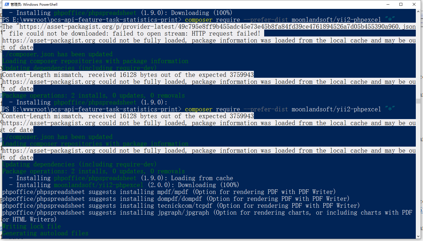 PS E:\wwwroot\pcs-api-feature-task-statistics-print> composer require --prefer-dist moonlandsoft/yii2-phpexcel "*" Content-Length mismatch, received 16128 bytes out of the expected 3759703 https://asset-packagist.org could not be fully loaded, package information was loaded from the local cache and may be ou t of date ./composer.json has been updated Loading composer repositories with package information Updating dependencies (including require-dev) https://asset-packagist.org could not be fully loaded, package information was loaded from the local cache and may be ou t of date Package operations: 5 installs, 0 updates, 0 removals - Installing markbaker/matrix (1.1.4): Downloading (100%) - Installing markbaker/complex (1.4.7): Downloading (100%) - Installing psr/simple-cache (1.0.1): Downloading (100%) - Installing phpoffice/phpspreadsheet (1.9.0): Downloading (100%) PS E:\wwwroot\pcs-api-feature-task-statistics-print> composer require --prefer-dist moonlandsoft/yii2-phpexcel "*" The "https://asset-packagist.org/p/provider-latest/49c795e8ff9b455adc45e73e45b8fa84fd39ce4761894526a7d05b455390a960.json " file could not be downloaded: failed to open stream: HTTP request failed! https://asset-packagist.org could not be fully loaded, package information was loaded from the local cache and may be ou t of date ./composer.json has been updated Loading composer repositories with package information Updating dependencies (including require-dev) Content-Length mismatch, received 16128 bytes out of the expected 3759943 https://asset-packagist.org could not be fully loaded, package information was loaded from the local cache and may be ou t of date Package operations: 2 installs, 0 updates, 0 removals - Installing phpoffice/phpspreadsheet (1.9.0): PS E:\wwwroot\pcs-api-feature-task-statistics-print> composer require --prefer-dist moonlandsoft/yii2-phpexcel "*" Content-Length mismatch, received 16128 bytes out of the expected 3759943 https://asset-packagist.org could not be fully loaded, package information was loaded from the local cache and may be ou t of date ./composer.json has been updated Loading composer repositories with package information https://asset-packagist.org could not be fully loaded, package information was loaded from the local cache and may be ou t of date Updating dependencies (including require-dev) Package operations: 2 installs, 0 updates, 0 removals - Installing phpoffice/phpspreadsheet (1.9.0): Loading from cache - Installing moonlandsoft/yii2-phpexcel (2.0.0): Downloading (100%) phpoffice/phpspreadsheet suggests installing mpdf/mpdf (Option for rendering PDF with PDF Writer) phpoffice/phpspreadsheet suggests installing dompdf/dompdf (Option for rendering PDF with PDF Writer) phpoffice/phpspreadsheet suggests installing tecnickcom/tcpdf (Option for rendering PDF with PDF Writer) phpoffice/phpspreadsheet suggests installing jpgraph/jpgraph (Option for rendering charts, or including charts with PDF or HTML Writers) Writing lock file Generating autoload files