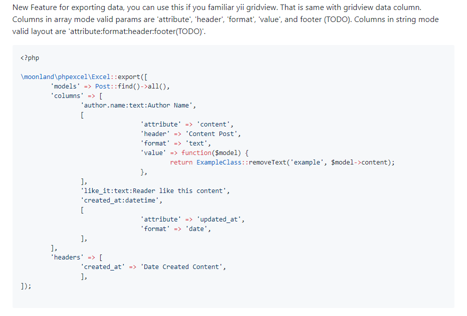 5、用于导出数据的新功能,如果您熟悉 yii gridview,则可以使用此功能。这与 gridview 数据列相同。数组模式中的列有效参数是 ‘attribute’,’header’,’format’,’value’和footer(TODO)。字符串模式有效布局中的列是’attribute:format:header:footer(TODO)’。如图4