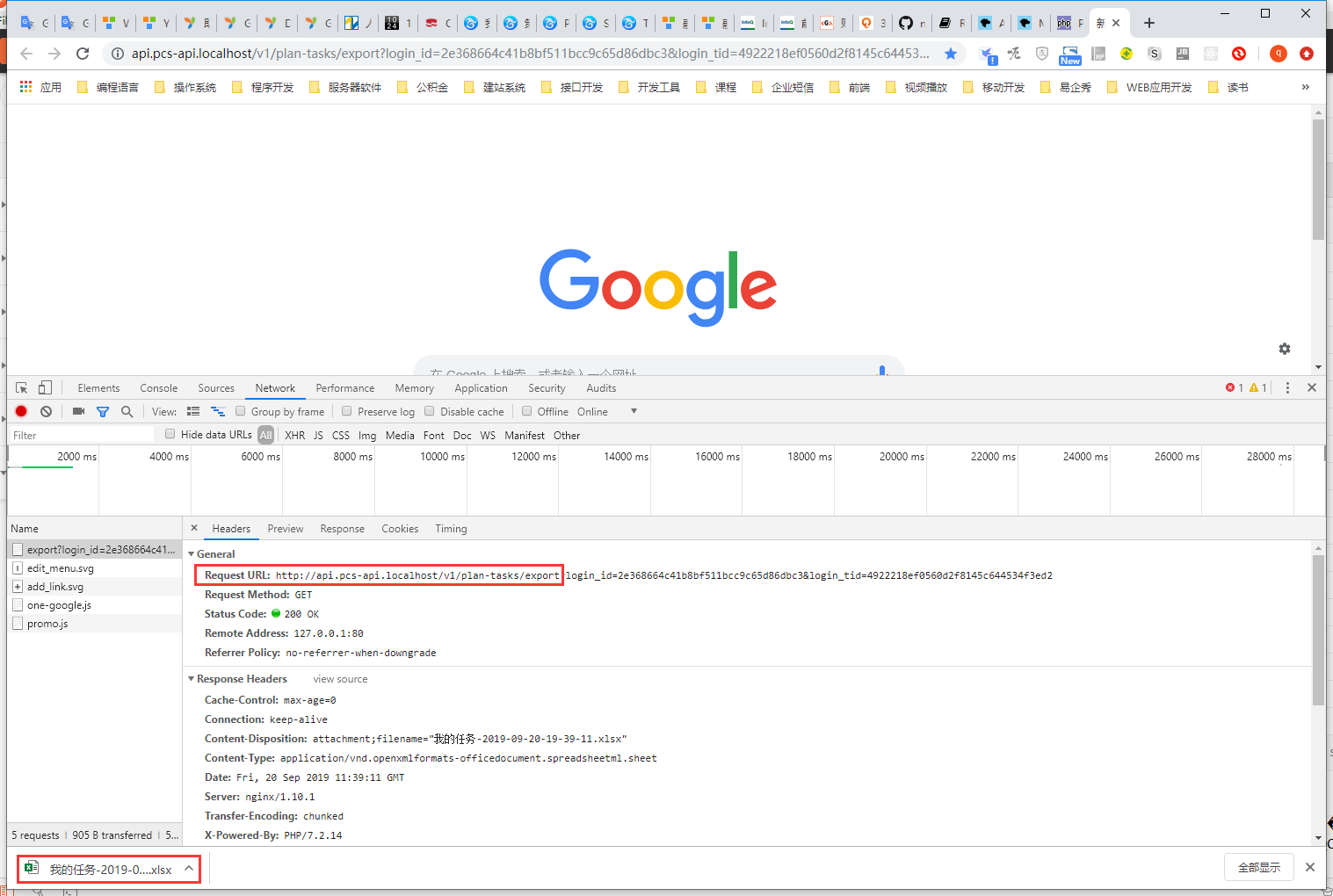 9、在浏览器中打开网址:http://api.pcs-api.localhost/v1/plan-tasks/export ,成功下载文件:我的任务-2019-09-20-19-39-11.xlsx,如图5