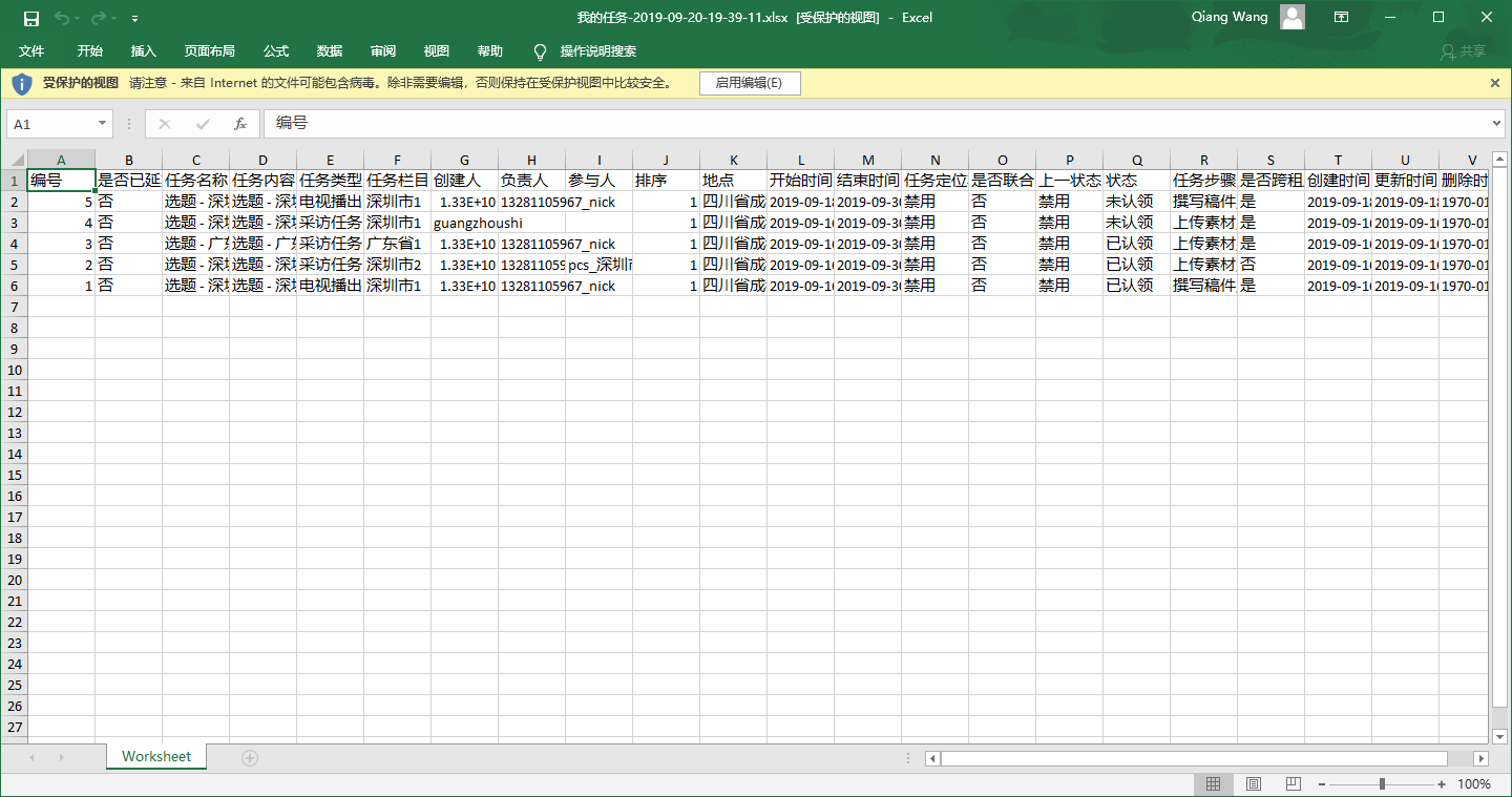 10、打开文件:我的任务-2019-09-20-19-39-11.xlsx,符合预期,如图6