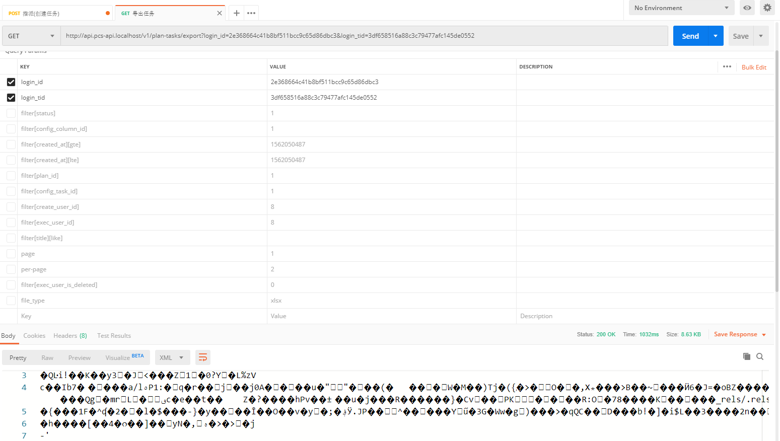 11、在 Postman 中打开网址:http://api.pcs-api.localhost/v1/plan-tasks/export ,点击 “Send” 按钮,响应乱码,如图7