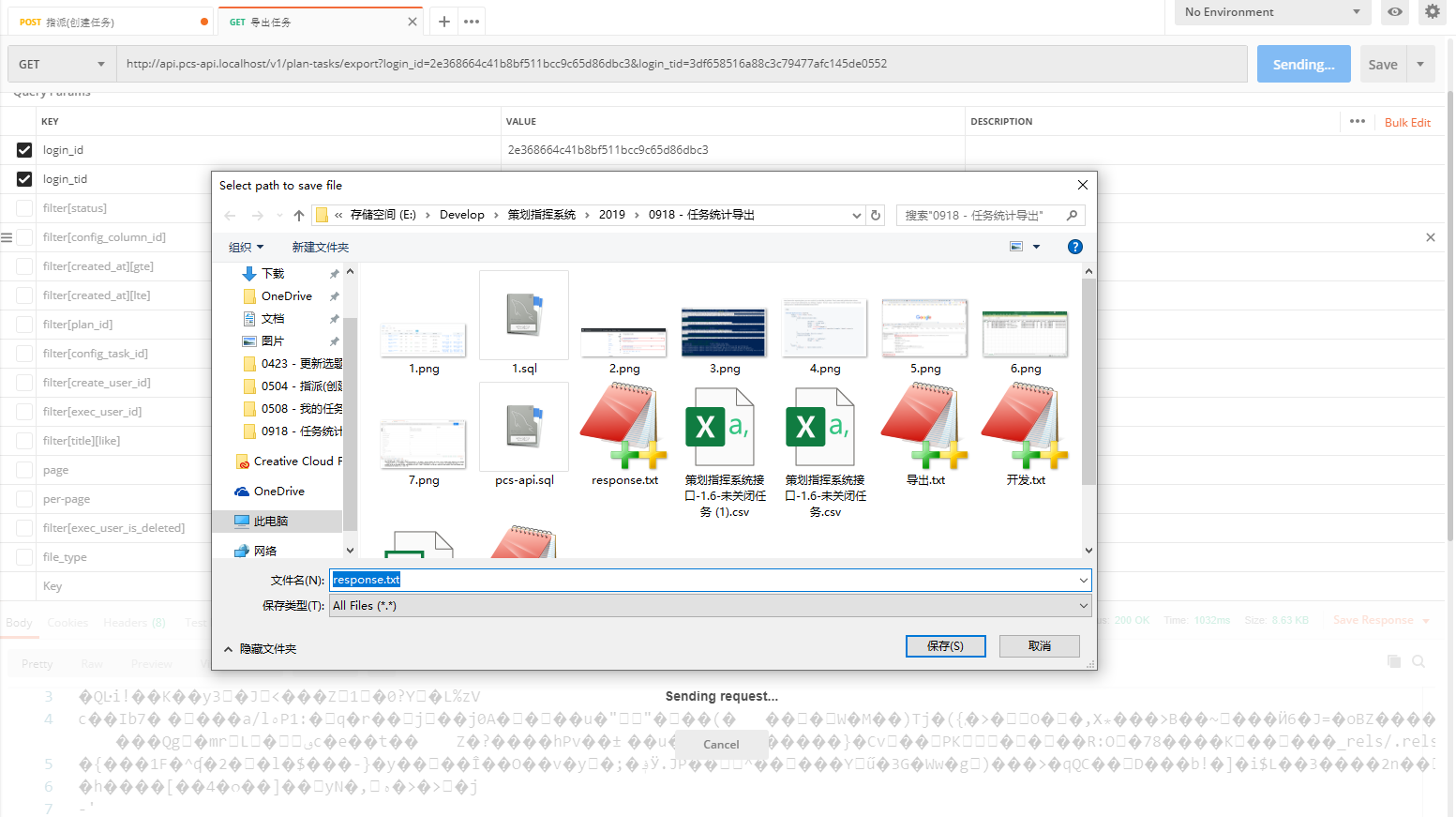 12、在 Postman 中打开网址:http://api.pcs-api.localhost/v1/plan-tasks/export ,点击 “Send and download” 按钮,下载名为:response.txt 的文件,且文件中无内容,如图8