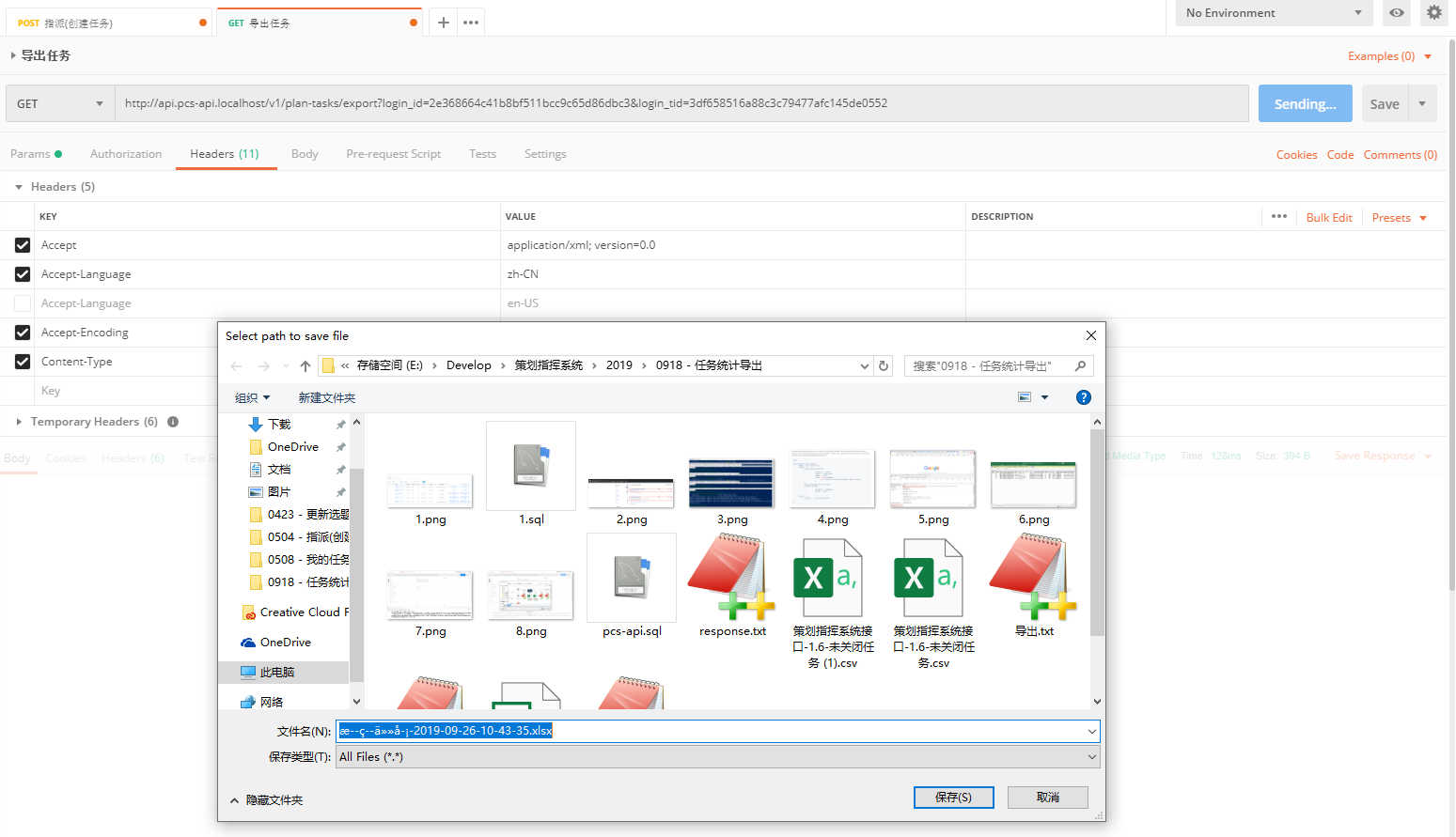 13、在 Postman 中设置 Headers , Accept:application/xml; version=0.0,打开网址:http://api.pcs-api.localhost/v1/plan-tasks/export ,点击 “Send and download” 按钮,下载名为:*-2019-09-26-10-44-40.xlsx 的文件,文件名中的中文乱码,但文件中的内容符合预期,如图9