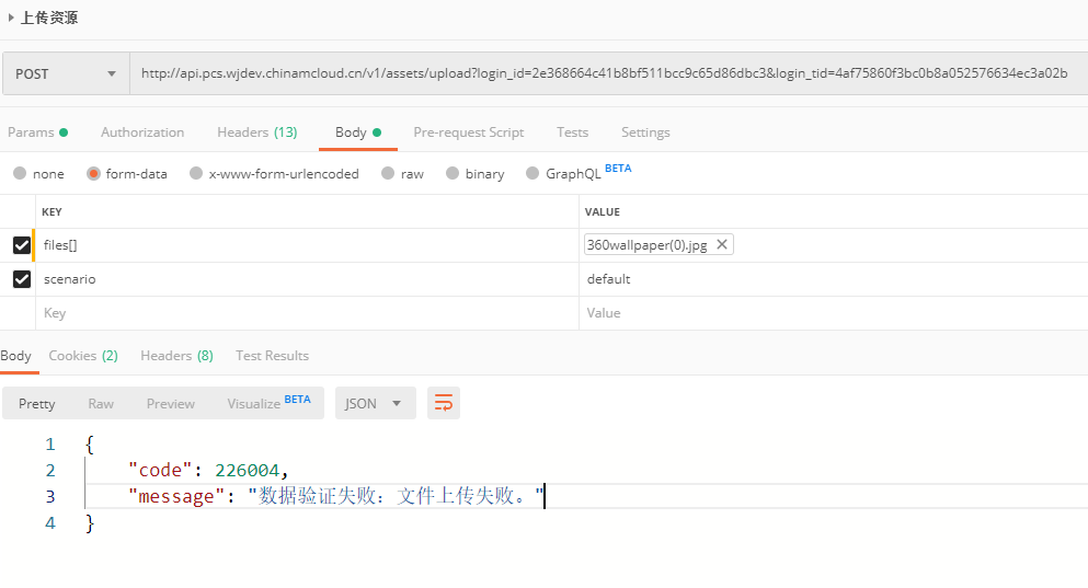1、在 Postman 中打开网址:http://api.pcs.wjdev.chinamcloud.cn/v1/assets/upload, 上传文件,响应失败,如图1