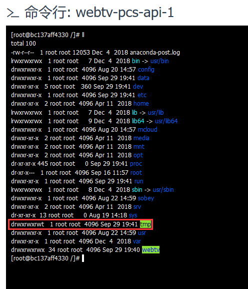 5、查看上一版本 /tmp 目录的权限,权限方面存在差异,分析得出结论,原因在于:/tmp 目录被覆盖进而导致权限被修改,如图4