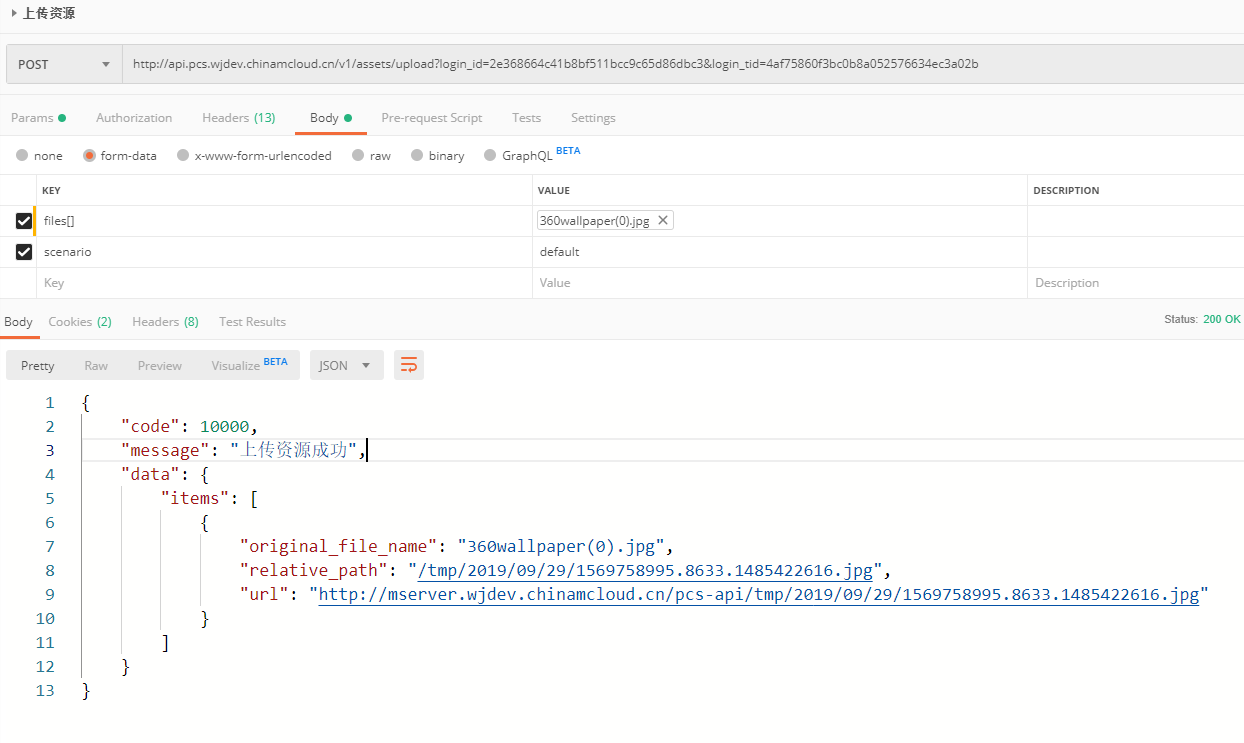 8、在 Postman 中打开网址:http://api.pcs.wjdev.chinamcloud.cn/v1/assets/upload, 上传文件,响应成功,如图7