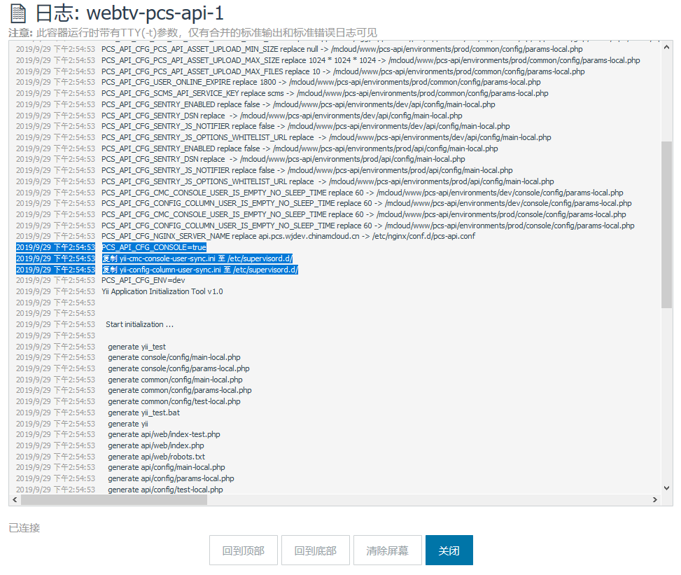 2019/9/29 下午2:54:53PCS_API_CFG_CONSOLE=true 2019/9/29 下午2:54:53复制 yii-cmc-console-user-sync.ini 至 /etc/supervisord.d/ 2019/9/29 下午2:54:53复制 yii-config-column-user-sync.ini 至 /etc/supervisord.d/