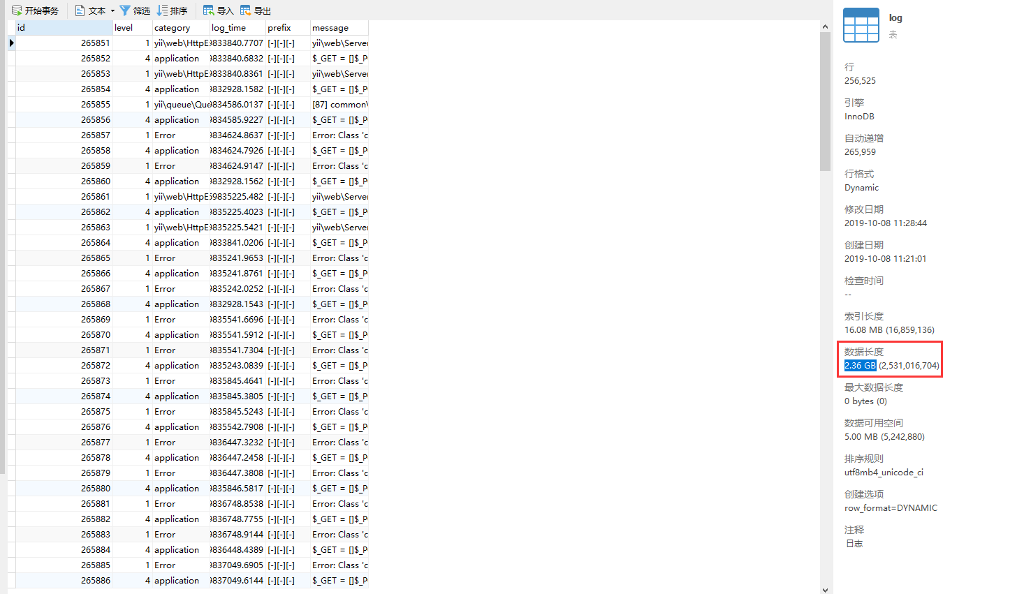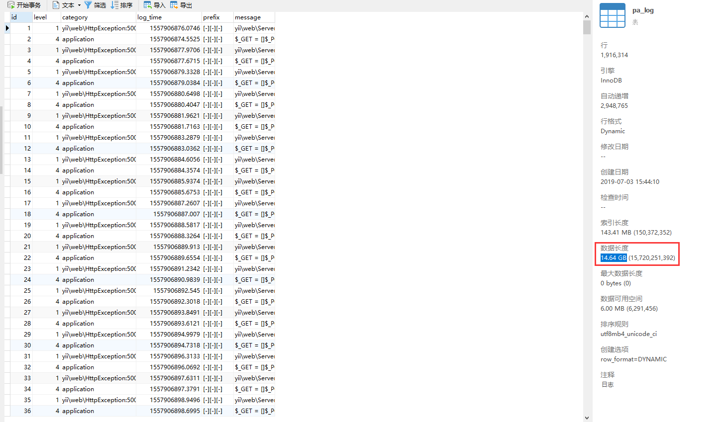 1、由于日志消息是存储于 MySQL 的 log 表中,在生产环境中,累积了大量的数据,log 表的数据长度已经达到 数百 GB ,因此,决定基于控制台命令行实现日志消息的定时删除,开发环境的 log 表的数据长度为 14.64 GB,如图1