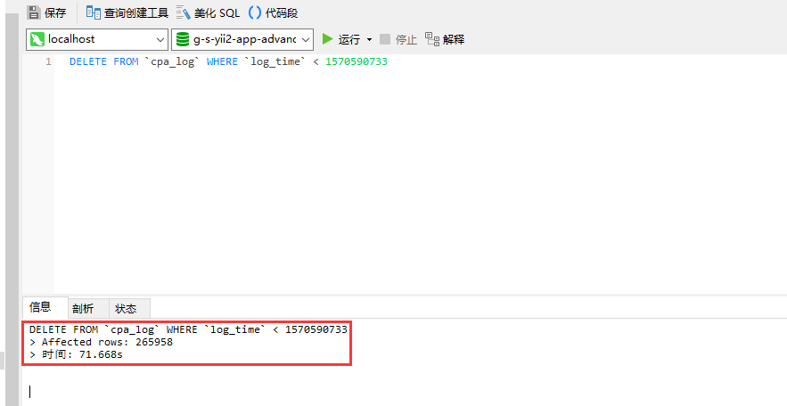 注:执行删除 SQL(),DELETE FROM `cpa_log` WHERE `log_time` < 1570590733,删除 26 万余条记录(1 天的日志消息),发现执行时间长达 1 分余钟,如图2